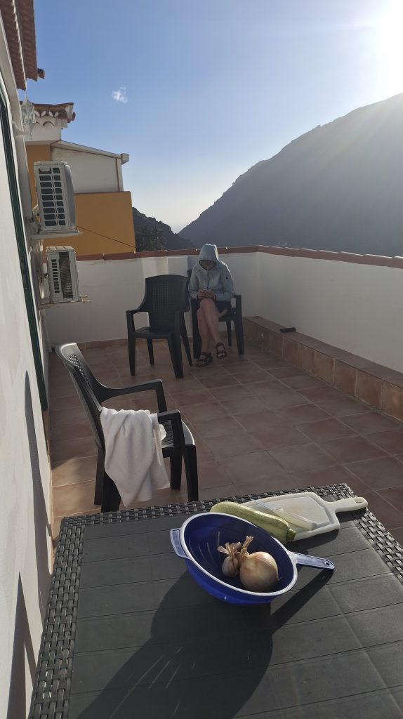 Ich fahre mit dem Bus zurück ins Appartement und pflege mich auf der Terrasse, während Margot noch ein wenig durchs Tal schlendert und zu Fuß zurückkommt. Wir essen zum zweiten Mal unsere Nudeln mit Gemüse von gestern und gehen früh schlafen. Heute Nacht war die Zeitumstellung und morgen wollen wir zeitig raus, um den Bus Richtung Chipude zur Fortsetzung der Inselumrundung zu nehmen .