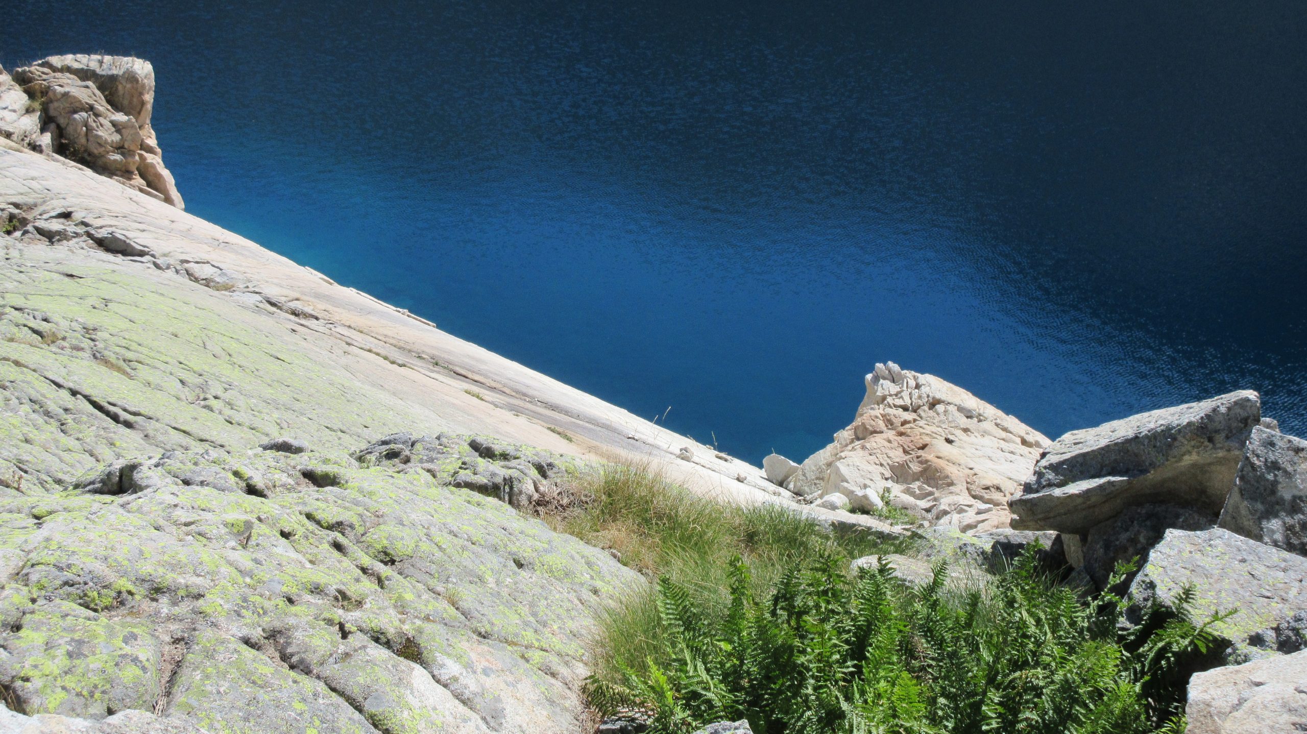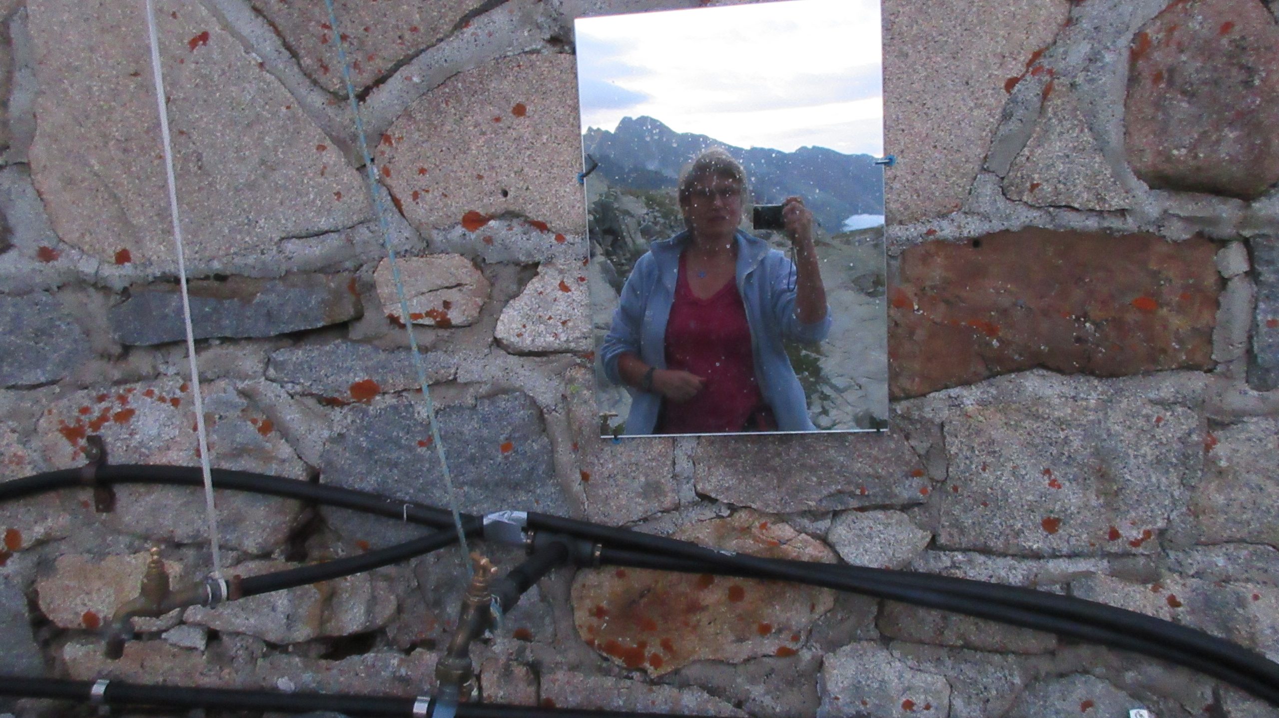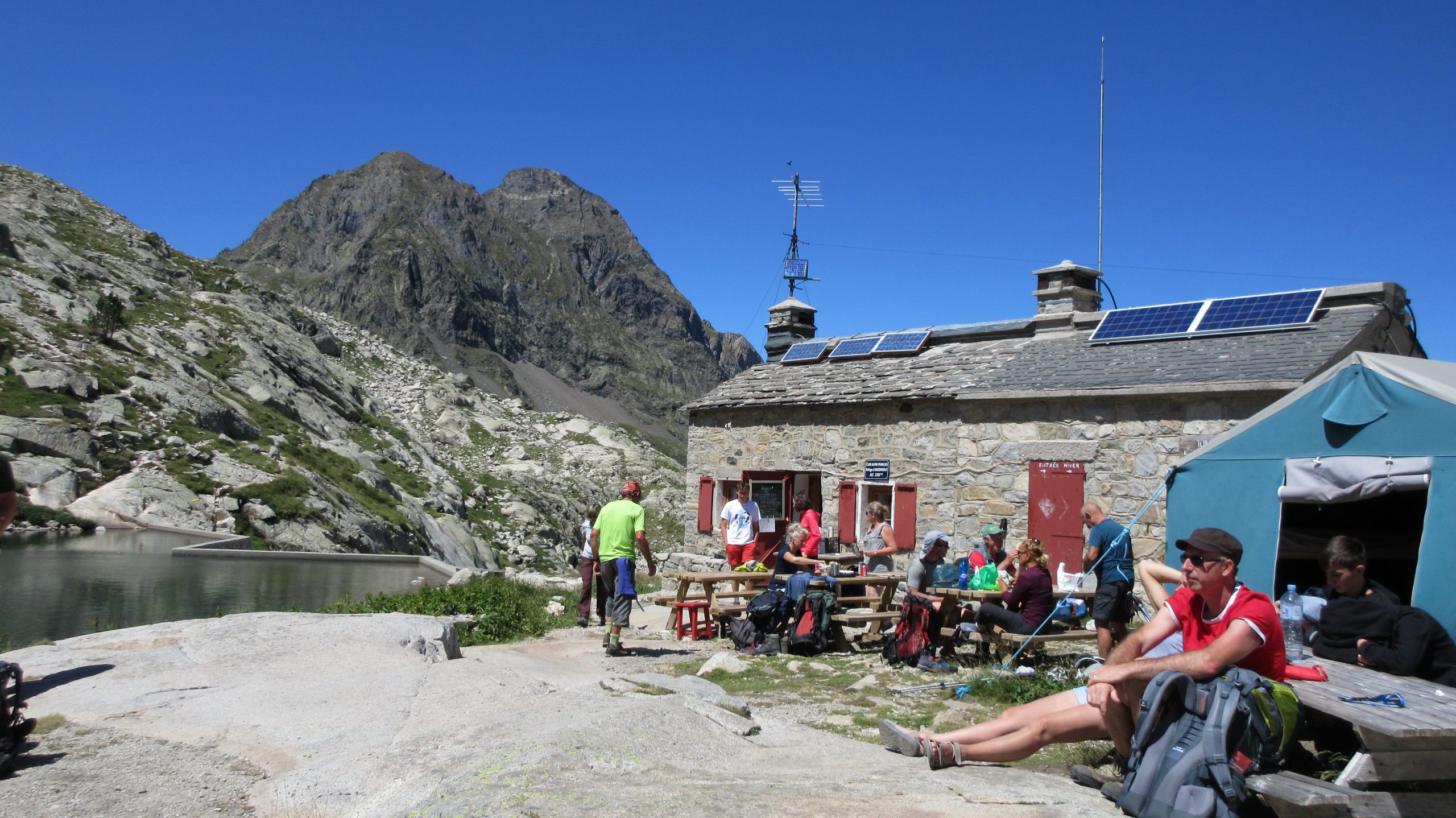 Dann ging es durch eine phantastische Berglandschaft zum Endpunkt einer Schmalspurbahn auf 1900m, die zum Bau der Talsperre angelegt wurde und jetzt als Touristenbahn fungiert. Insofern liegt das kleine Refuge des französischen Alpenvereins nicht völlig aus der Welt. Tagsüber kommen viele Tagestouristen die 90- minütige Wanderung hoch, aber abends sind hier an dem kleinen Stausee nur noch die 30 bis 40 Übernachtungsgäste übrig. Aber – nach Angaben der Hüttenwirtin – ist es das einzige nicht renovierte Refuge des CAF. Kaltes Wasser und als Luxus etwas lauwarmes aus sonngewärmtem Schlauch hinter dem Haus (ohne Sichtschutz), 50 m daneben Plumpsklo ( ihr erinnert euch an die französischen Autobahn – Toiletten ?) und ein Sardinenschlafsaal mit Bettenbreite 60cm. Ich habe wieder den Bergsee vorgezogen…. Ach so, natürlich auch nicht genug Strom für unsere Smartphones- so wird sogar das Blogschreiben schwierig – vom Veröffentlichen gar nicht zu reden. Aber: der Blick hier am Refuge ist phantastisch !