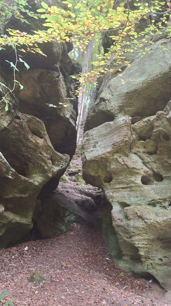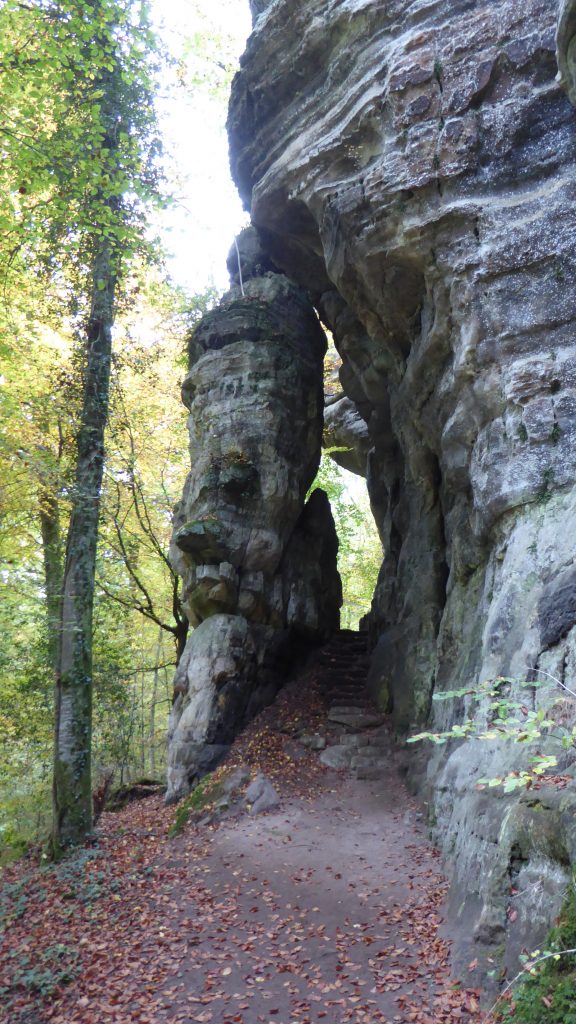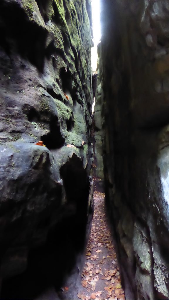 Der Mullerthal- Trail führt dann auf halber Höhe zwischen den Sandsteinfelsen entlang: enge, dunkle Spalten,  die ich nur ohne Rucksack auf dem Rücken passieren konnte (Schlankheitstest). Es ist ein unablässliches Auf und Ab über schmale Pfade und unendliche Treppen. Genial (trotz der Treppen).