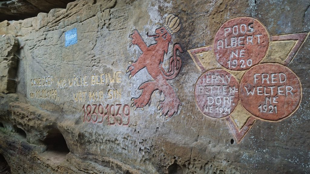 „de Roude Léiw“ Felsen bei Scheidgen mit Felsmalereien aus dem Jahre 1939 zum 100. Jubiläum der Unabhängigkeit Luxemburgs mit dem Luxemburgischen Wahlspruch: „Mir wölle bleiwe wat mir sin„. Ausgeführt wurden Die Gravierungen von drei Freunden aus dem Dorf, die kurz danach zur deutschen Wehrmacht zwangsrekrutiert wurden. Einer von ihnen starb 1944 in russischer Gefangenschaft, die beiden anderern kehrten ins Dof zurück, Die Malerei sollte auf Befehl der deutschen Besatzung entfernt werden- sie wurde dstattdessen von Dorfbewohnern zuzemetirt – der Zement ließ sich nach 1945 wieder entfernen …