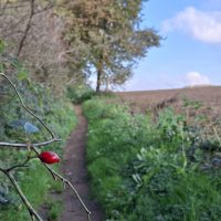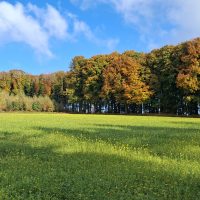 Heute scheint die Sonne, windstill – goldener Oktober, und alle einschlägigen Gedichte fallen mir ein …. Der Weg verläuft zunächst langsam abwärts durch einen Buchenwald, dann über viele Kilometer auf der Hochebene an Feldrainen entlang und durch Heckenwege … einfach schön!