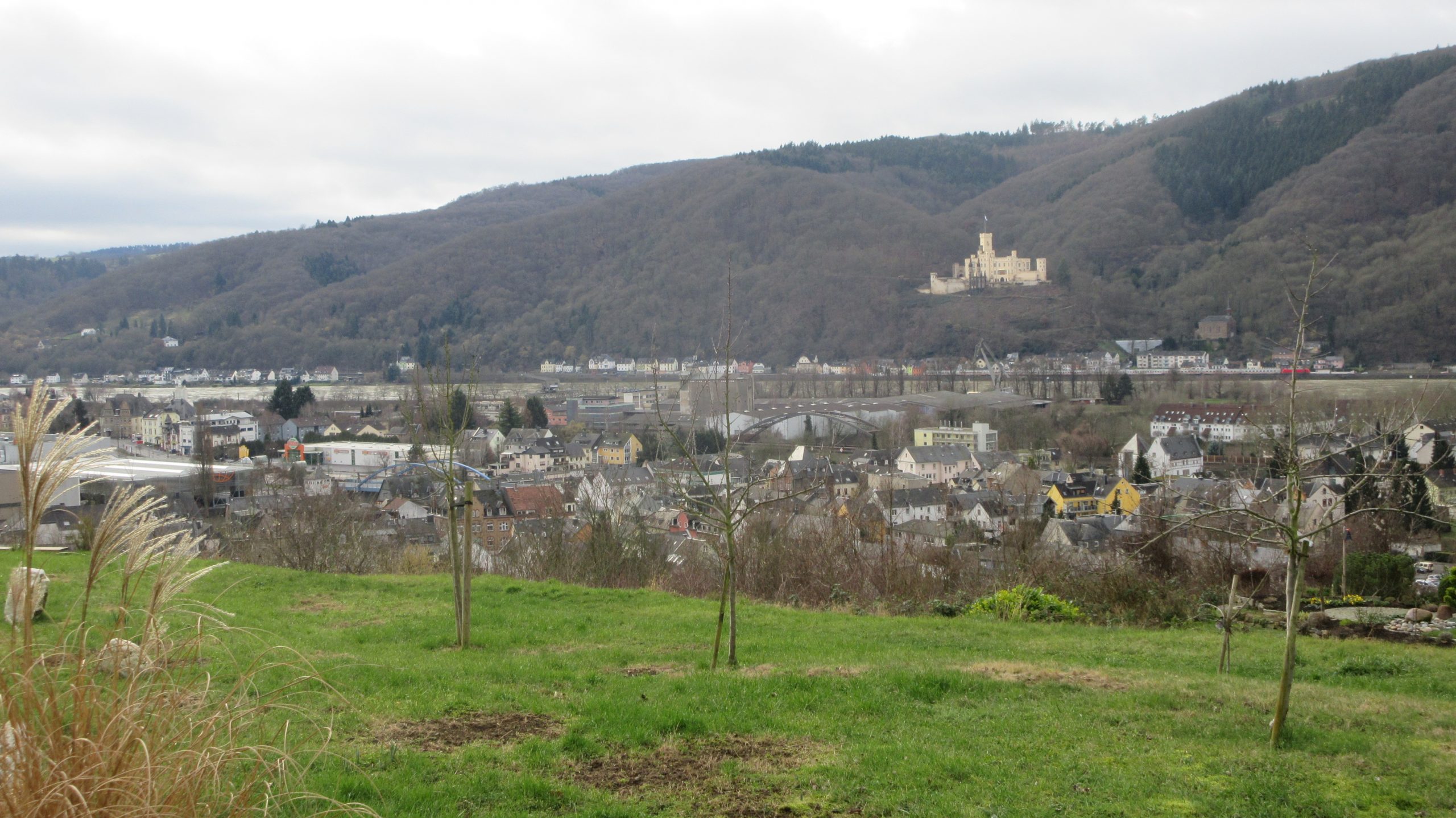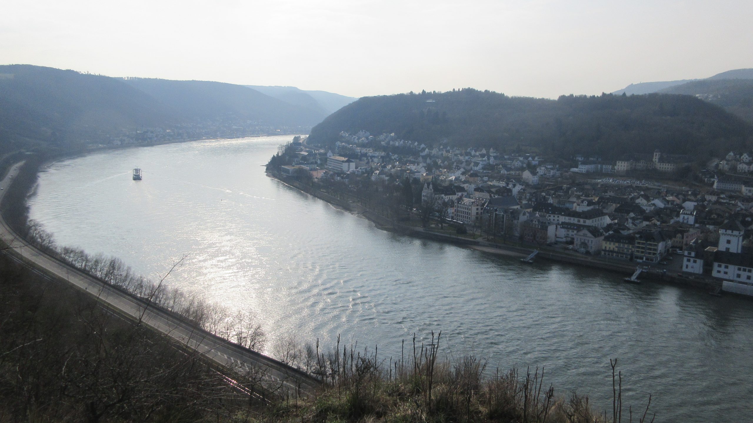 und ins Rheintal auf die Burg Stolzenfels linksrheinisch