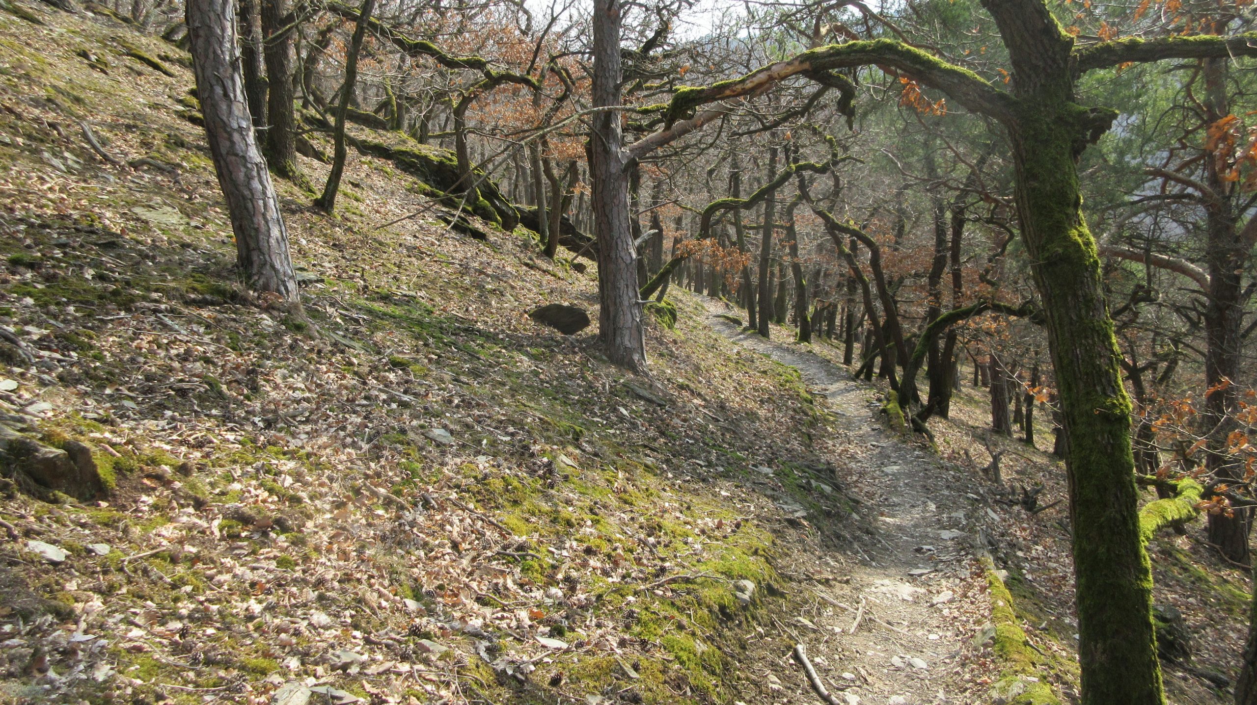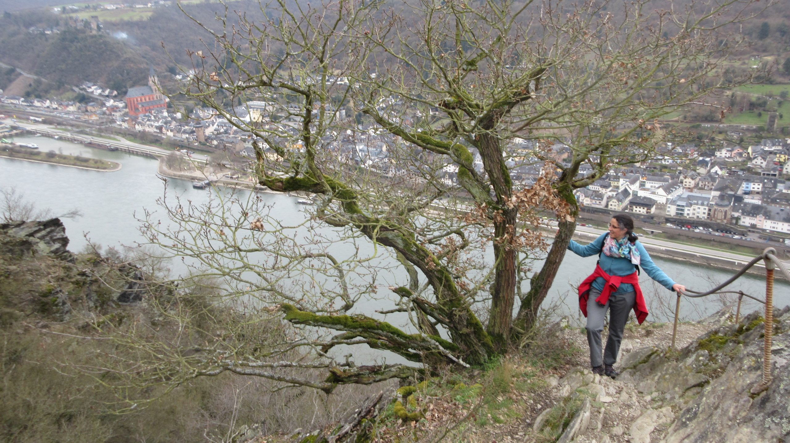 Nach leckerem Frühstücksbuffet (manchmal hat ein besseres Hotel auch seine Vorteile) wandere ich in der Sonne auf Wegen, die dem Rheinsteig alle Ehre machen: auf halber Höhe, da wo früher Weinstöcke und Obstgärten waren und sich heute Buschwald ausbreitet, und manchmal auch einige Meter höher durch niedrige, geduckte Steineichenwälder, zwischen denen die Schieferfelsen hervortreten.