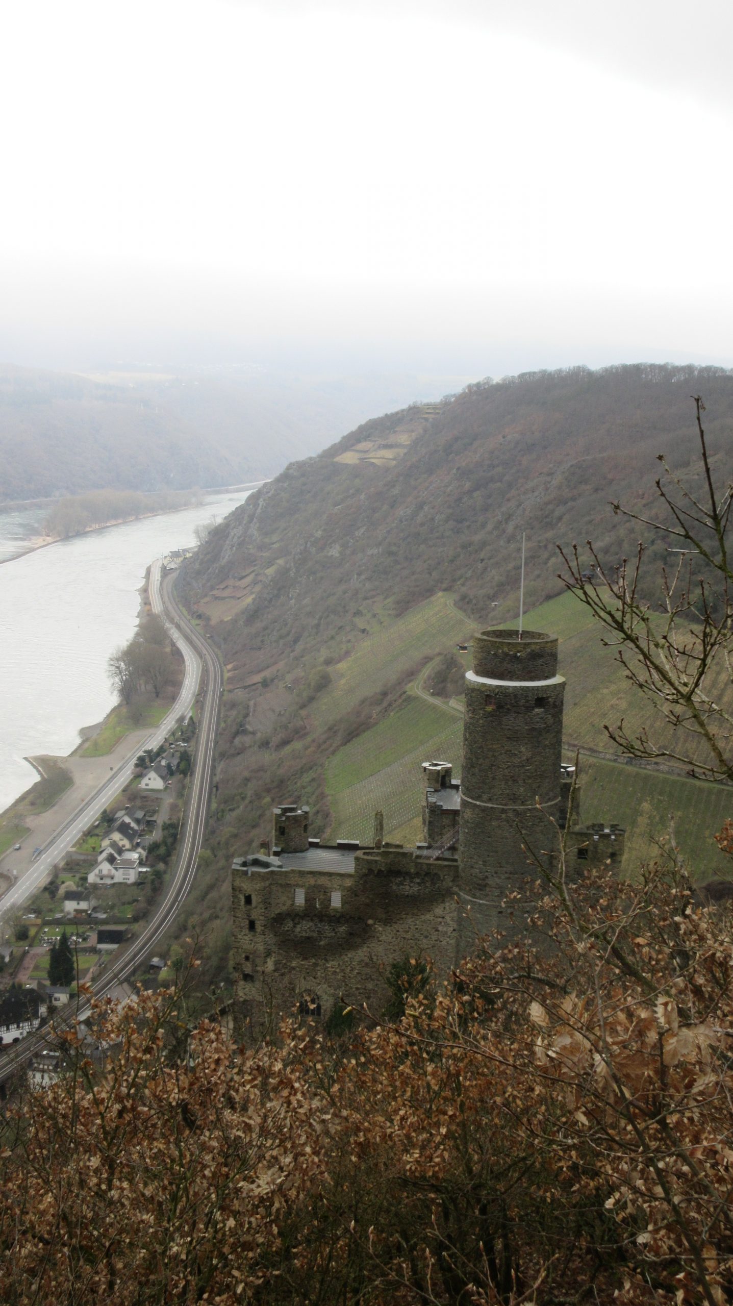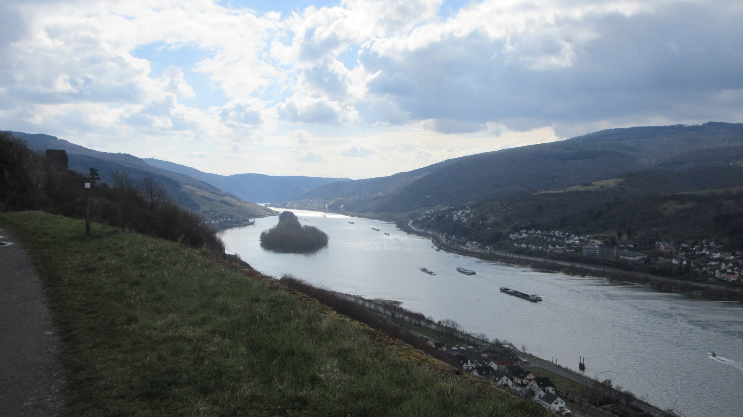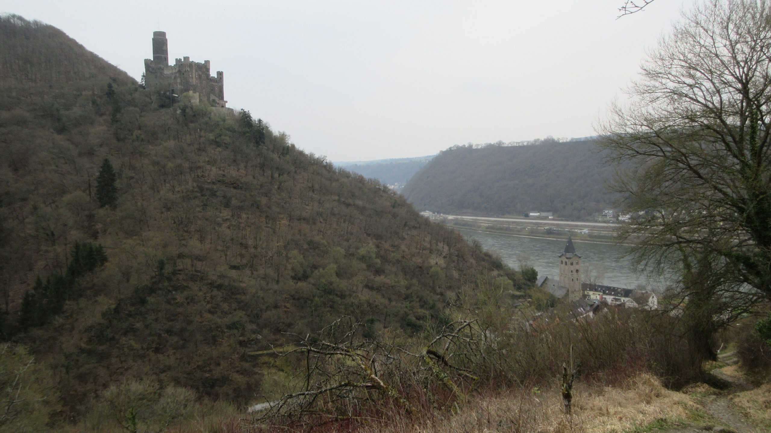 Heute Morgen scheint die Sonne! Gutes Frühstück in der JH, dann nehme ich zunächst eine kleine Abkürzung: ich schenke mir 3 km Weg an alten Bergwerken vorbei und steige langsam am Hang hoch zum Rheinsteig. Der Vorteil – dauernd geniale Blicke – vor allem auf die Rheininsel mit der Pfalzgrafenburg (gefühlte 1000 Photos, die ich nachher erstmal zum größten Teil löschen muss). Der Weg heute ist weitaus einfacher als gestern – fast nur Forstwege und kleine Fahrstraßen durch die Weinberge. Nur zweimal etwas steilere, steinige Passagen und immer mehr als hervorragend mit Stahlseilen gesichert. Aber ich bin nicht so böse über den leichteren Weg: eigentlich sollten es 28 km werden – warum mein Navi am Ende 25 zählt, weiß ich nicht – wird aber schon stimmen.