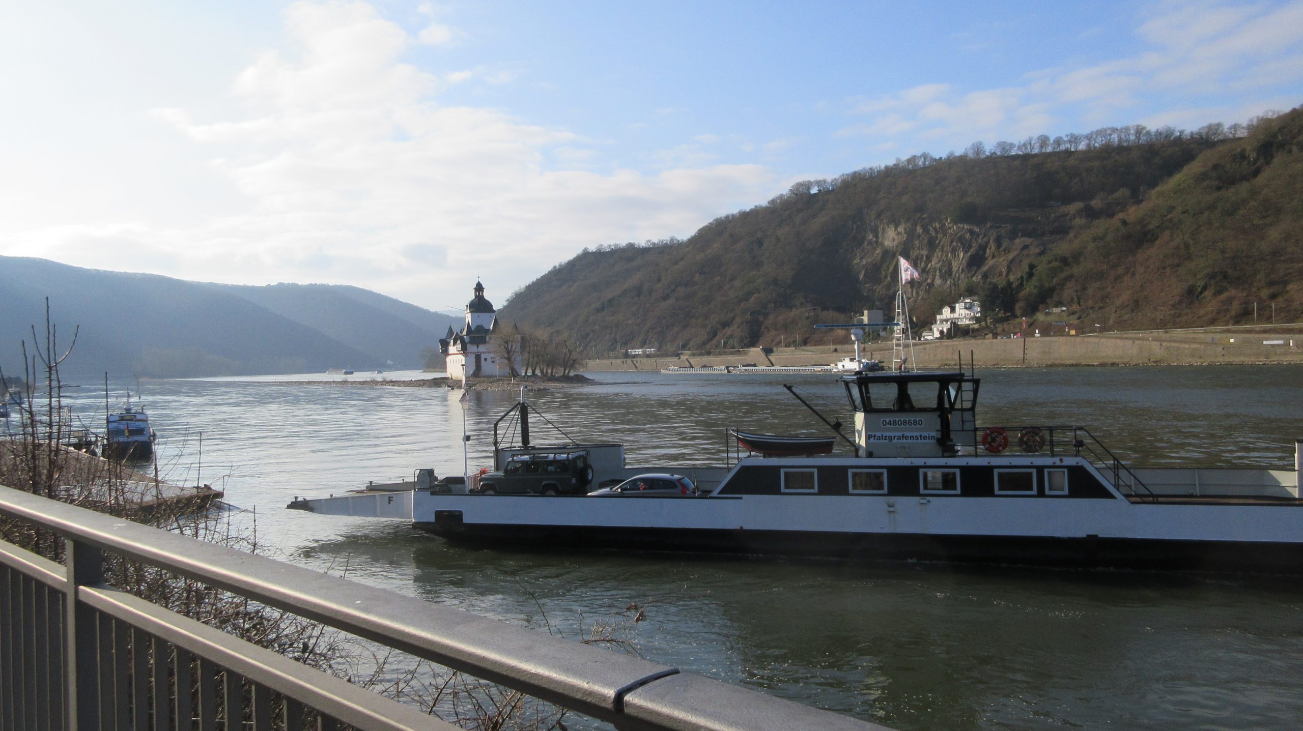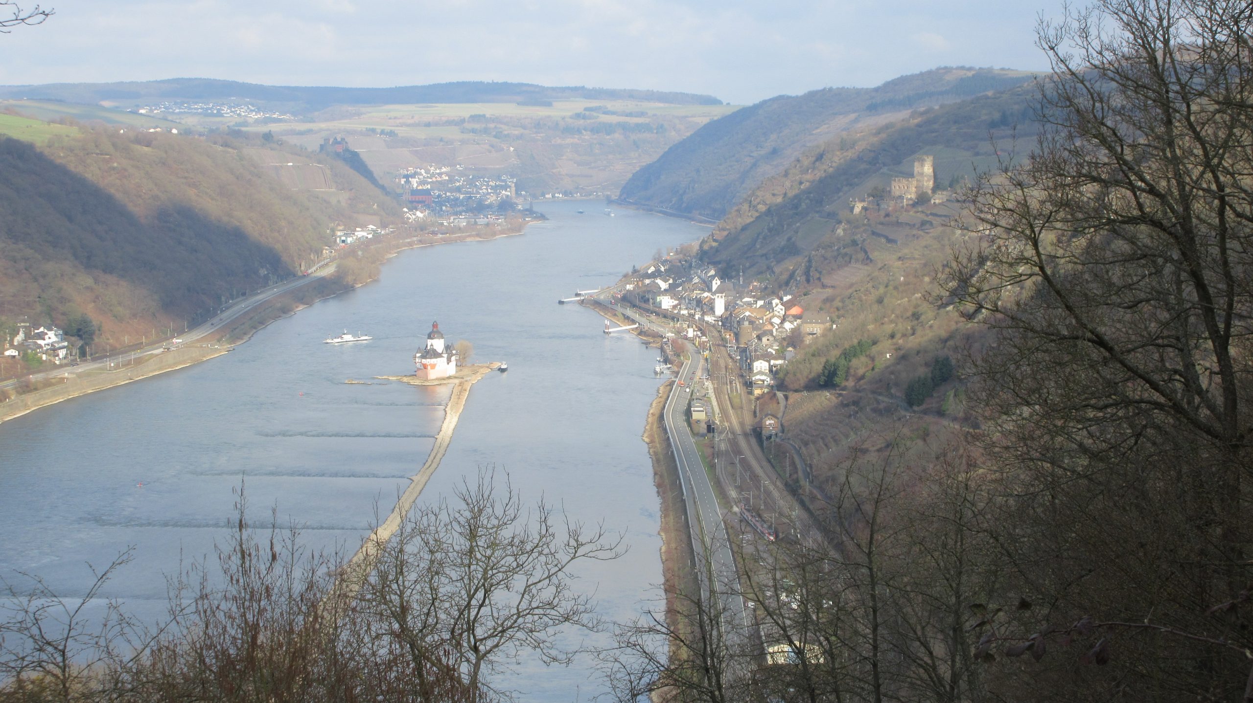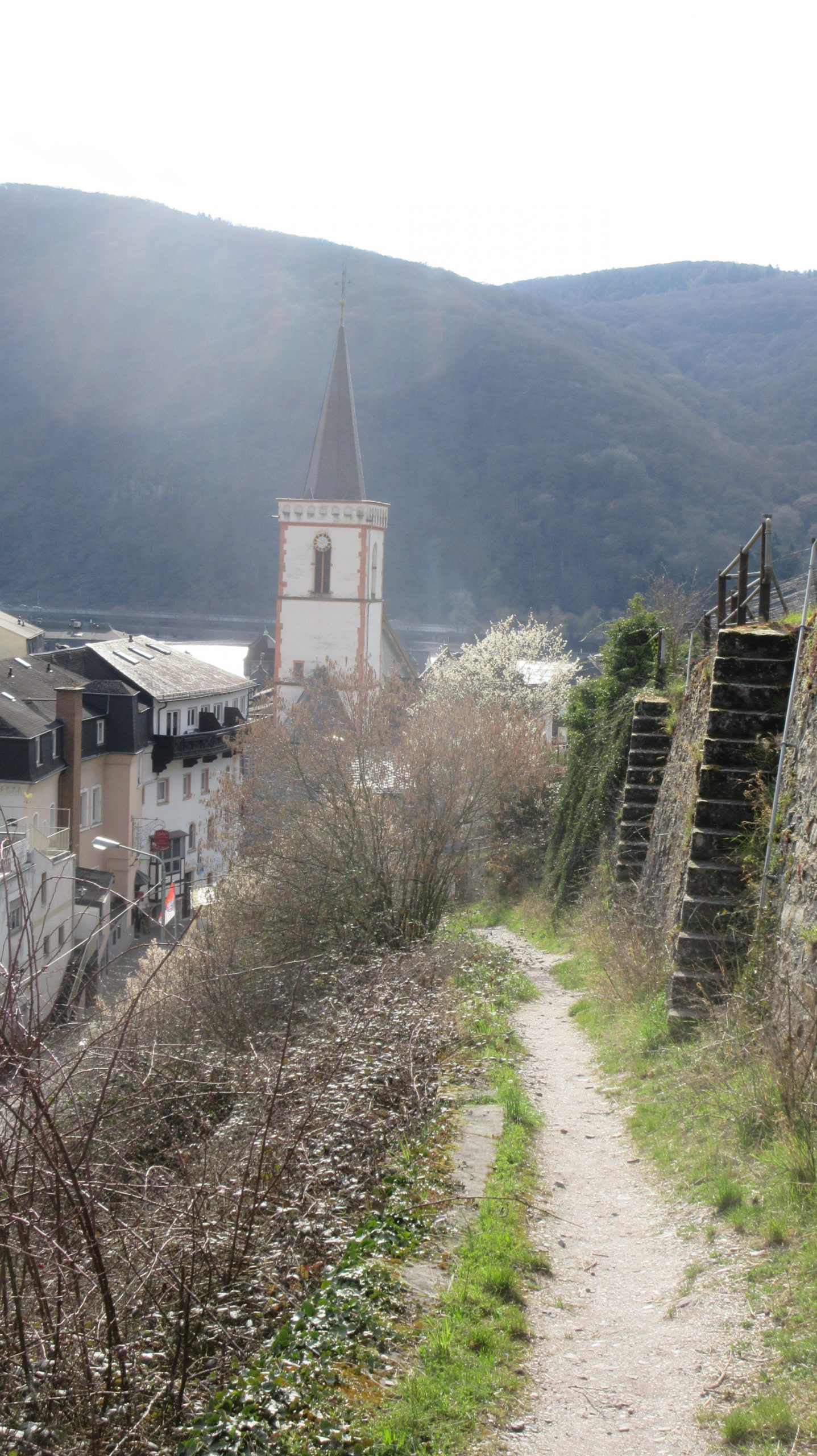 Heute Morgen scheint die Sonne! Gutes Frühstück in der JH, dann nehme ich zunächst eine kleine Abkürzung: ich schenke mir 3 km Weg an alten Bergwerken vorbei und steige langsam am Hang hoch zum Rheinsteig. Der Vorteil – dauernd geniale Blicke – vor allem auf die Rheininsel mit der Pfalzgrafenburg (gefühlte 1000 Photos, die ich nachher erstmal zum größten Teil löschen muss). Der Weg heute ist weitaus einfacher als gestern – fast nur Forstwege und kleine Fahrstraßen durch die Weinberge. Nur zweimal etwas steilere, steinige Passagen und immer mehr als hervorragend mit Stahlseilen gesichert. Aber ich bin nicht so böse über den leichteren Weg: eigentlich sollten es 28 km werden – warum mein Navi am Ende 25 zählt, weiß ich nicht – wird aber schon stimmen.