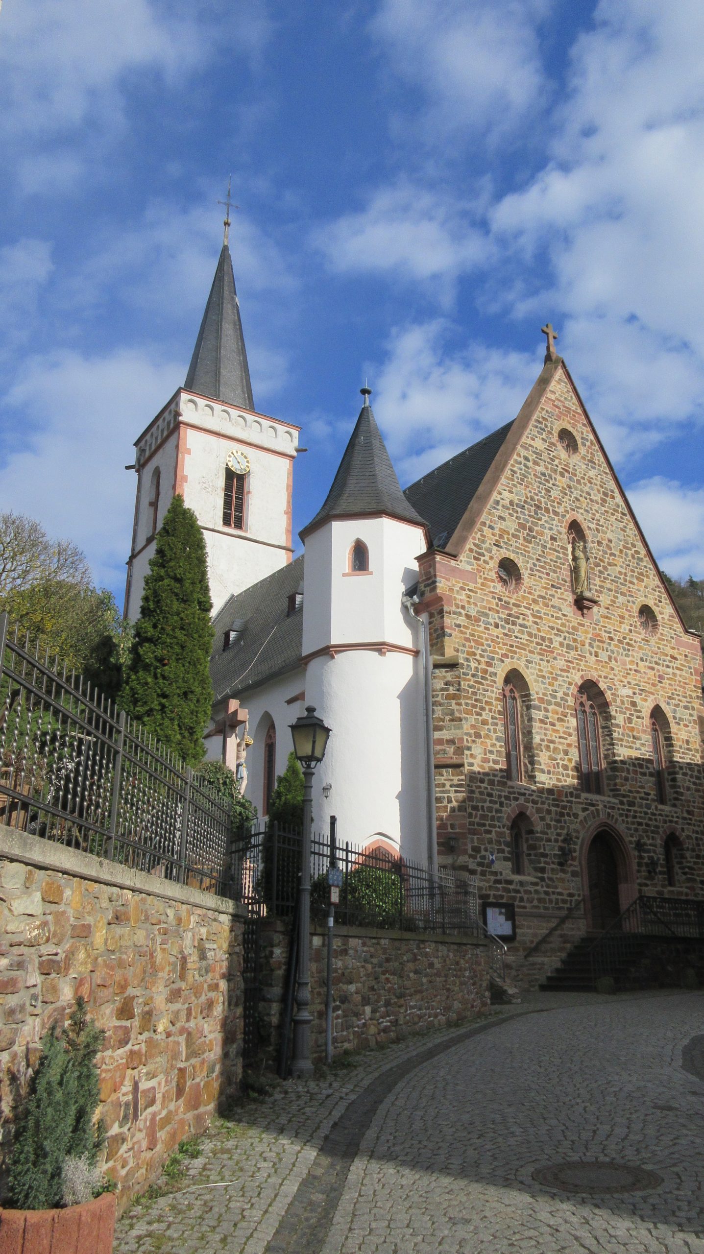 Leider kann man hier nur durch das mir aus Portugal und Spanien so wohl bekannte Gitter gucken – ich versuche dennoch einige Fotos. Dann komme ich im Kirchenvorraum mit einem älteren Mann ins Gespräch, der erzählt, dass er – als ehemaliger Kameramann beim ZDF- die Kirche filmen soll und gleich eine Führung dazu bekomme … ob ich mitkommen wolle? Ich habe mich wahnsinnig geärgert, dass es schon 3 Uhr war und ich noch etwa 10 km bis zu meinem Hotel in Schlangenbad hatte (ab 6 ist es stockfinster und der Weg geht durch den Wald…). Also leider keine Besichtigung…Schlangenbad ist ein total verschlafener Kurort mit dem Charme von anno dazumal. Das Beste war das Essen – der Koch hatte im Elsass gelernt und der Flammenkuchen schmeckte original französisch– elsässisch. Das Lokal war so voll, dass ich zu anderen Leuten an den Tisch gesetzt wurde: die stellten sich auch als Wanderer des Rheinsteiges heraus und kamen darüber hinaus noch aus Gelsenkirchen – Gesprächsthemen gerettet…. Heute ist bei dem phantastischen Herbstwetter die Kamera heiß gelaufen – deswegen diese Bilderflut…
