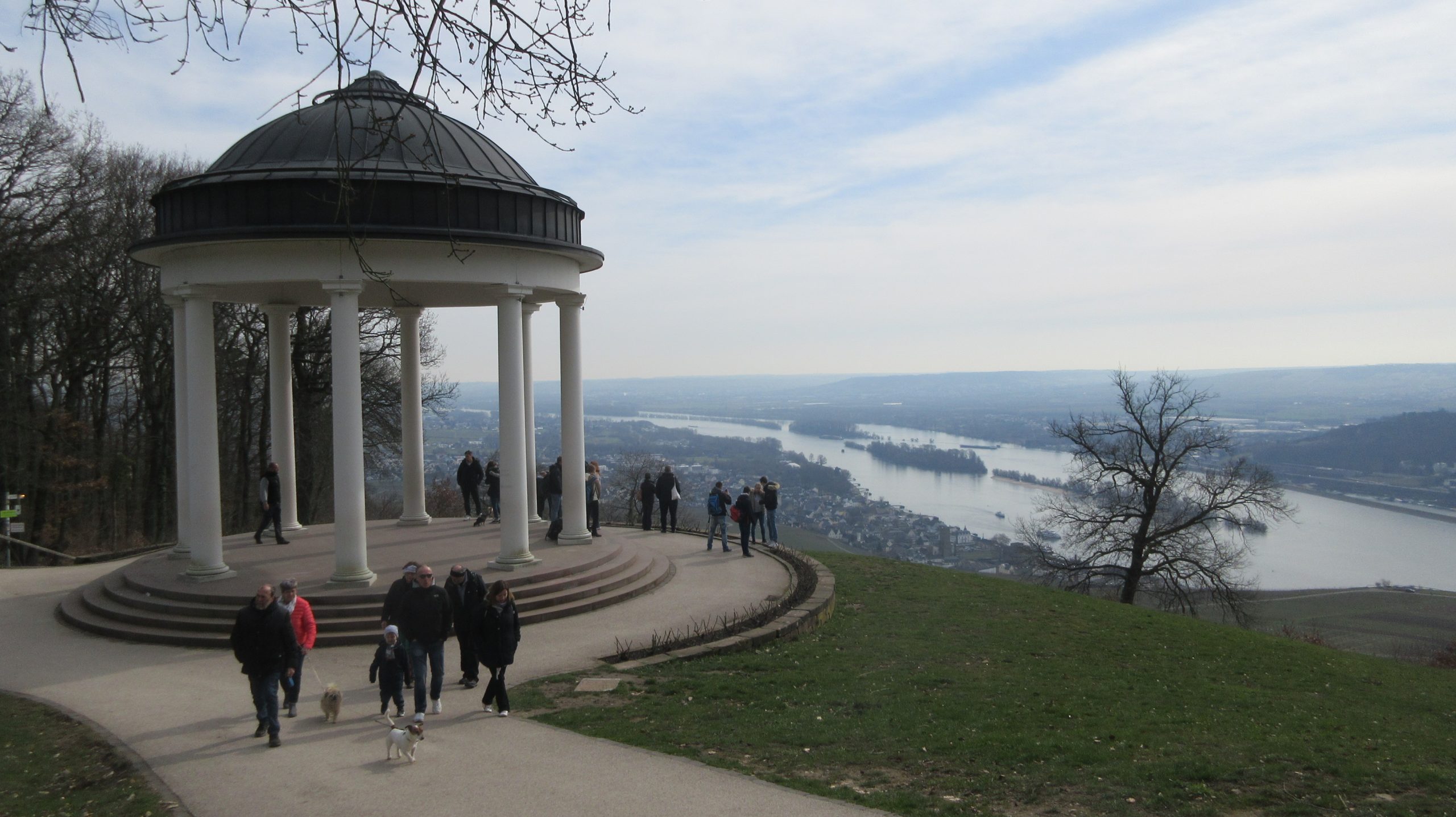 Zunächst geht’s durch den Wald langsam hoch Richtung Jagdschloss Niederwald. Das wurde Ende des 18. Jahrhunderts zusammen mit einem durchkomponierten Landschaftspark als romantische Wildnis angelegt: mit einer Zauberhöhle, einer nachgebauten Burgruine mit Blick auf die Lahnmündung und den Mäuseturm bei Bingen, einem römischen Tempel u.s.w. – Phantasialand lässt grüßen… . Aber die meisten Leute – und heute treffe ich viele davon (wohl auch, weil zwei Seilbahnen den mühseligen Aufstieg von gut 200 Höhenmetern etwas vereinfachen..) – sind auf dem Weg zum Niederwalddenkmal. Im ersten Moment denke ich: uff, dass das bisher keiner gesprengt hat! Zu sehen sind Germania, die Wacht am Rhein, heldenhafte bayrische und preußische Truppen in wehrhafter Standhaftigkeit geeint gegenüber dem Feind, der Erzengel Michael, das Schwert schwingend….. und in der Mitte Kaiser Wilhelm, als großer Kaiser des Deutschen Volkes (alles großgeschrieben – vielleicht hätte ich Majuskeln wählen sollen?).