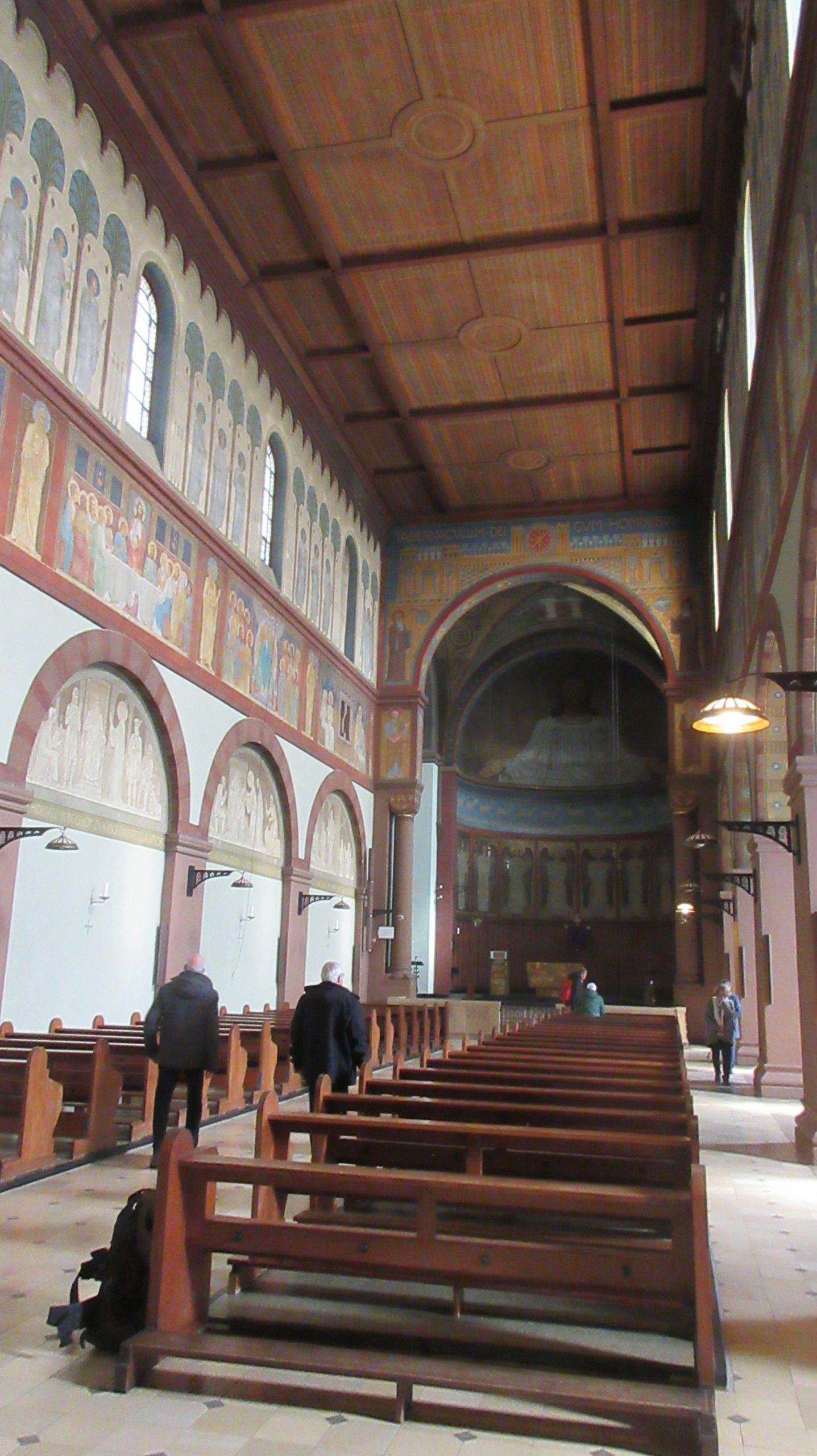 Aber so einfach ist das mal wieder nicht. Die erklärenden Tafeln beschreiben, dass der Text der „Wacht am Rhein“ auf dem Denkmal entschärft war: nicht gegen die „Welschen“, sondern gegen einen allgemeinen Feind sollte sich das geeinte Deutschland wehren. Und Germania (so ähnlich zu sehen wie die „Marianne“ in Frankreich oder „Victoria“ in England) blickt nach Osten – auf ihr eigenes Land und also nicht feindselig nach Westen…. also eher ein Aufruf zur inneren Einheit als zum Krieg …. Von da aus wandere ich noch die letzten Kilometer zum Kloster Sankt Odilienberg (ein Kloster, dass von Hildegard von Bingen gegründet wurde ,wie so viele andere auch in dieser Gegend). Der Bau entstand allerdings zu Beginn des 20. Jahrhunderts – und die Ausmalung erinnert an Jugendstil und Odilon Redon. Ungewöhnlich. Leider ist außer der Kirche dort heute alles geschlossen – schade.