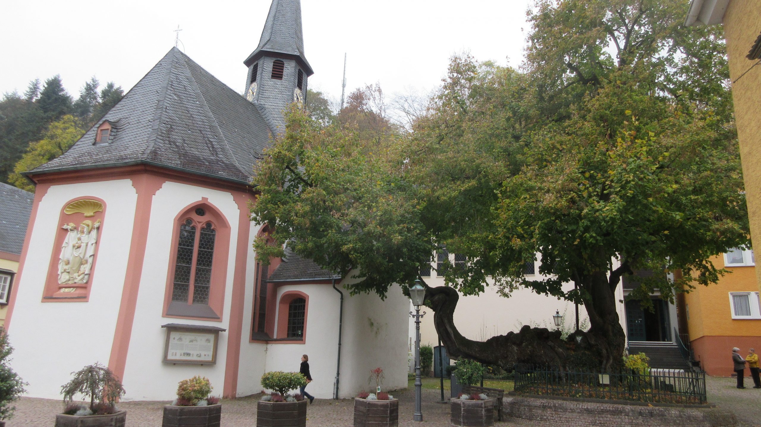 Die Pfarrkirche – mit elektrischen Glocken und Neon – strahlendem Kreuz ! Modern times !