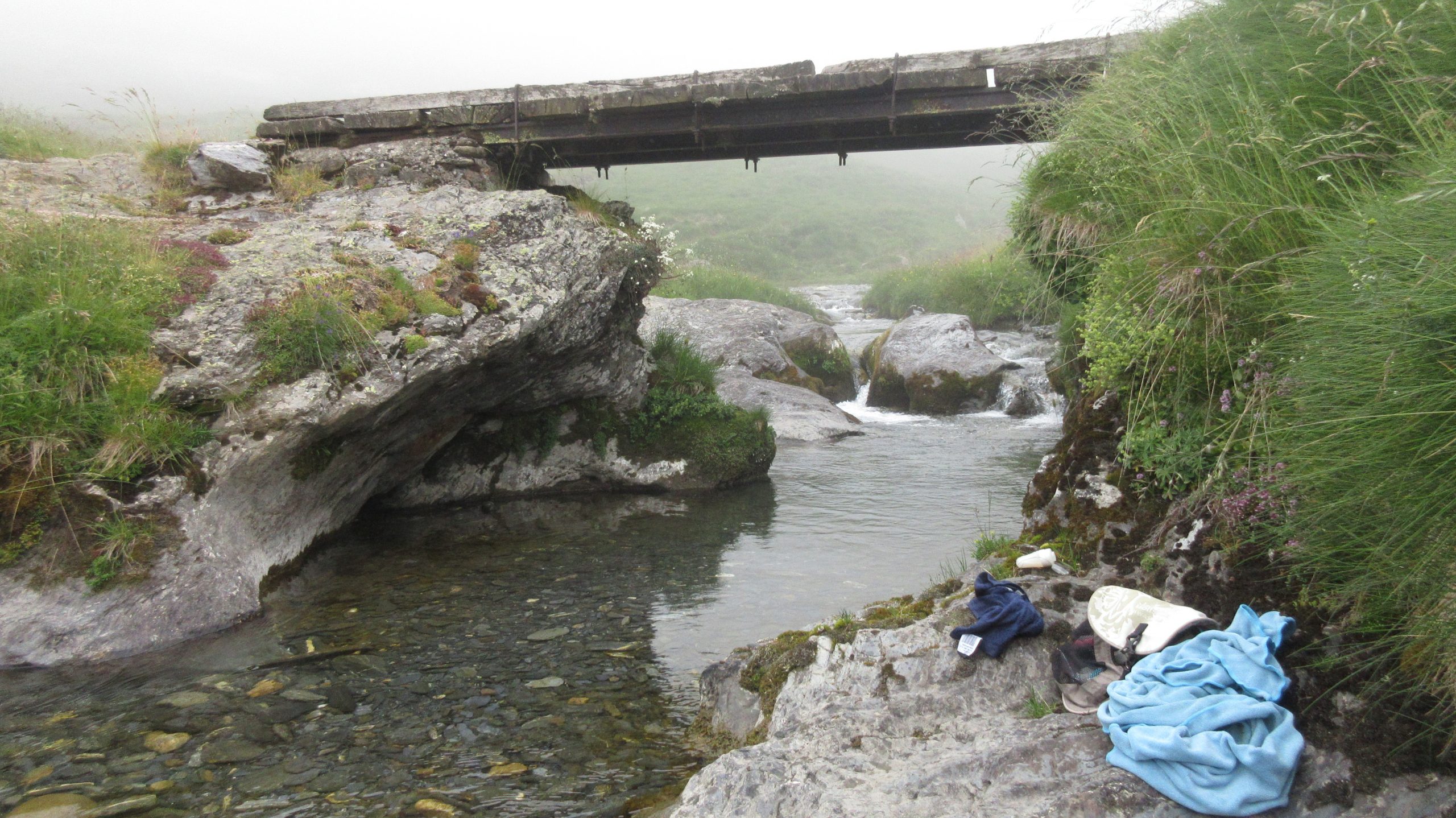 Also steigen wir auf zur Hourquette d‘ Ossoue, sehen die Reste des Gletschers Oulettes de Gaube und biegen bald auf einen kleineren Weg zum Col d‘ Araillé nach Norden ab. Inzwischen wandern wir in den Wolken, können aber die Wegmarkierungen gut erkennen. Ist auch ganz wichtig, da wir inzwischen in einem Geröllfeld klettern. Ein Wanderer in Gegenrichtung spricht uns an, dass wir die Talseite wechseln sollen, der Weg ginge dort weiter. Aber hier sind doch Markierungen ? Ich wechsle also erst weiter talaufwärts und verstehe langsam: Hier ist das Geröllfeld so steil, dass ich Mühe habe vorwärts zu kommen. Endlich geschafft- wir sind am Col.