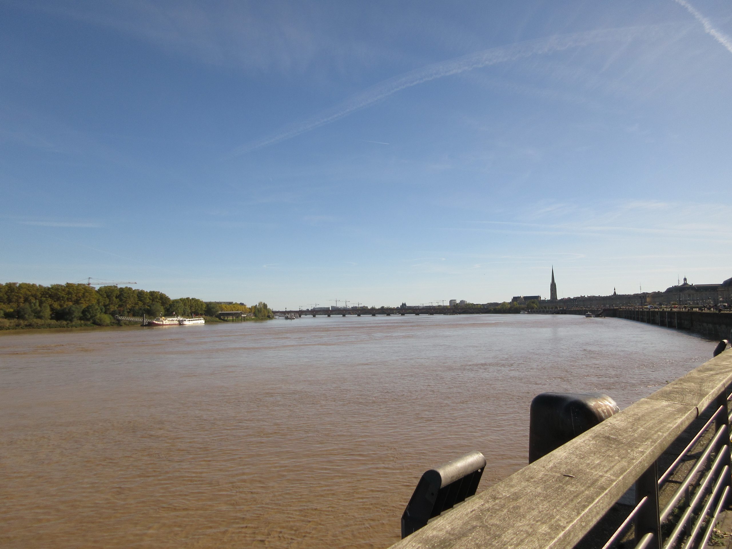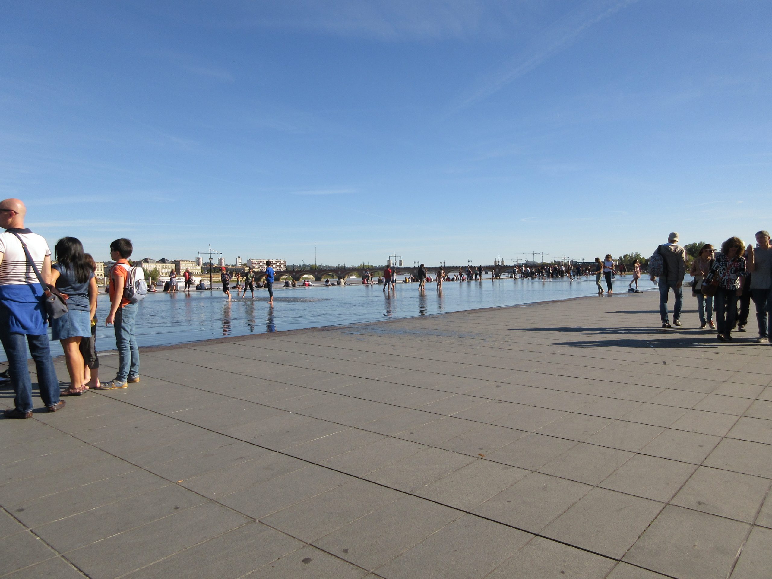 Dann nach gut einer Stunde in Bordeaux: schon aus der Luft fasziniert mich die Stadt mit der blitzenden Garonne. Und angekommen ändert sich mein erster Eindruck nicht: nachdem ich mir ein Fahrrad gemietet habe und in einem Hostel untergekommen bin (nicht so einfach – auch in Frankreich sind Herbstferien!) bin ich dann die Promenade an der Garonne entlanggefahren : pulsierendes Leben: ganz viele Skater und Jogger, super Skatebahnen – für jeden Schwierigkeitsgrad – viele Cafés direkt am Fluss eine riesige , 10 cm Tiefe Wasserfläche, in ( oder auf ) der sich hunderte von kleinen Kindern tummeln…..
