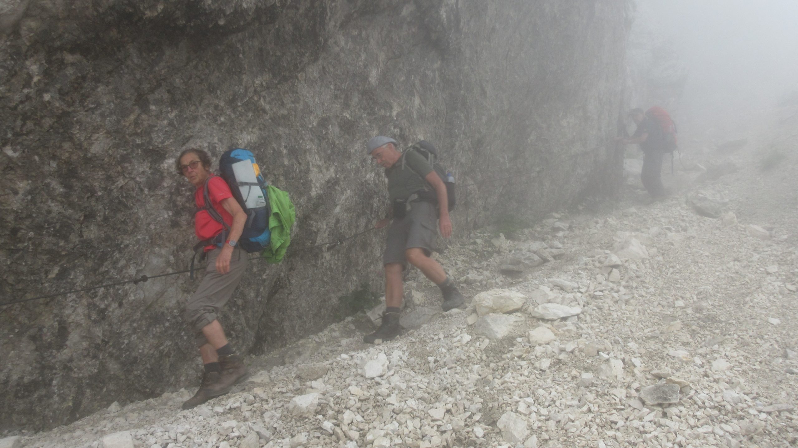 Wir nehmen am nächsten Pass ( Luknja 1771m ) aber nicht den Klettersteig, sondern wollen über einen im Rother – Führer beschriebenen Weg durch ein Nachbartal zur nächsten Hütte wandern – Pech nur, dass sich der Einstieg dazu trotz intensiver Suche nirgendwo finden lässt. Zunächst gehen wir aber oben am Pass im Nebel steil über Geröll bergab – ich bin ziemlich glücklich, dass sich an der Felswand für die ersten 50 m eine Seilsicherung befindet: so richtig einfach ist der Abstieg nun wirklich nicht.